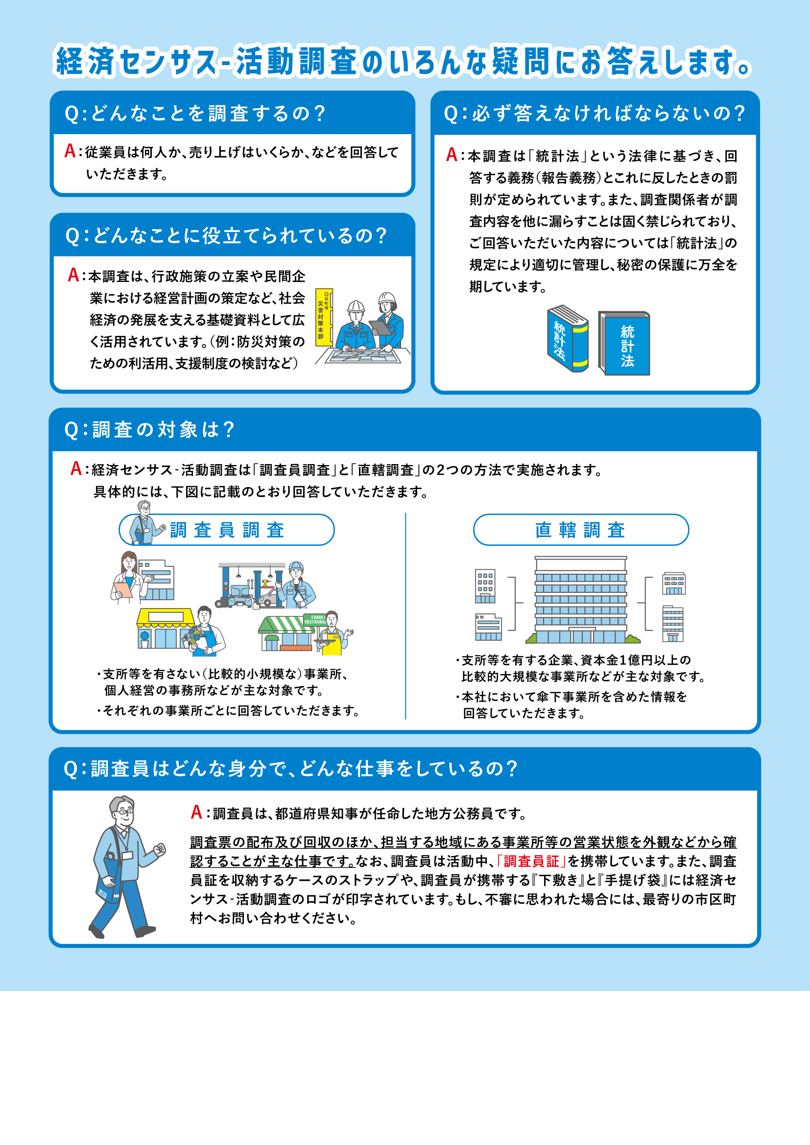 調査対象者の方々におかれましては、郵送もしくは名札を着用した調査員が事務所等へ訪問いたしますので、調査のご回答にご協力お願いいたします。